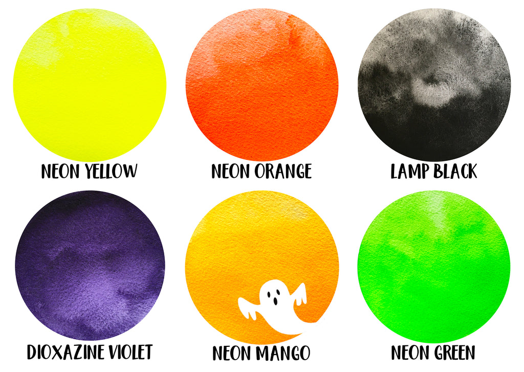 All colors suitable for creating Halloween art - on one page! Browse single colors and sets with watercolor postcards.