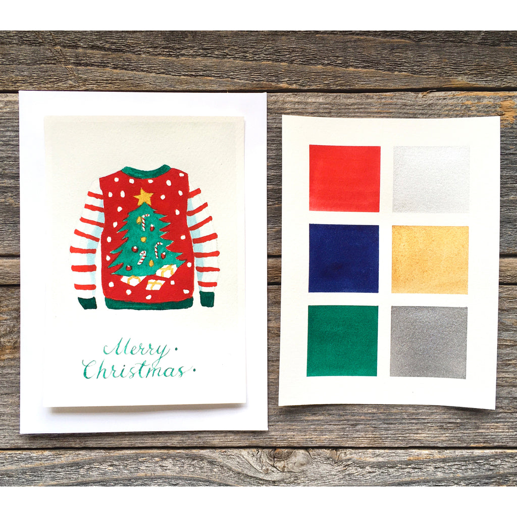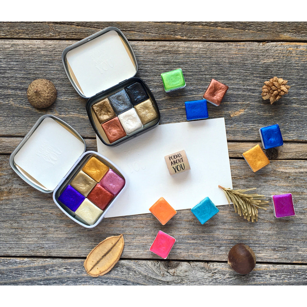 Handmade watercolor set includes twelve bright and lightfast colors suitable for calligraphy and lettering.